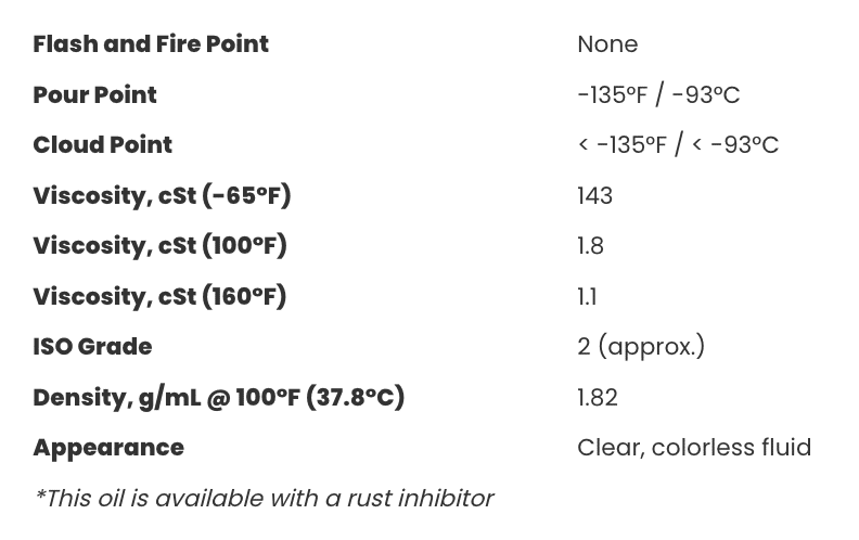 This oil is safe, nonflammable, and chemically inert – safe for oxygen, chlorine, and most reactive gas services. It has good lubricity, high thermal stability, and low compressibility.